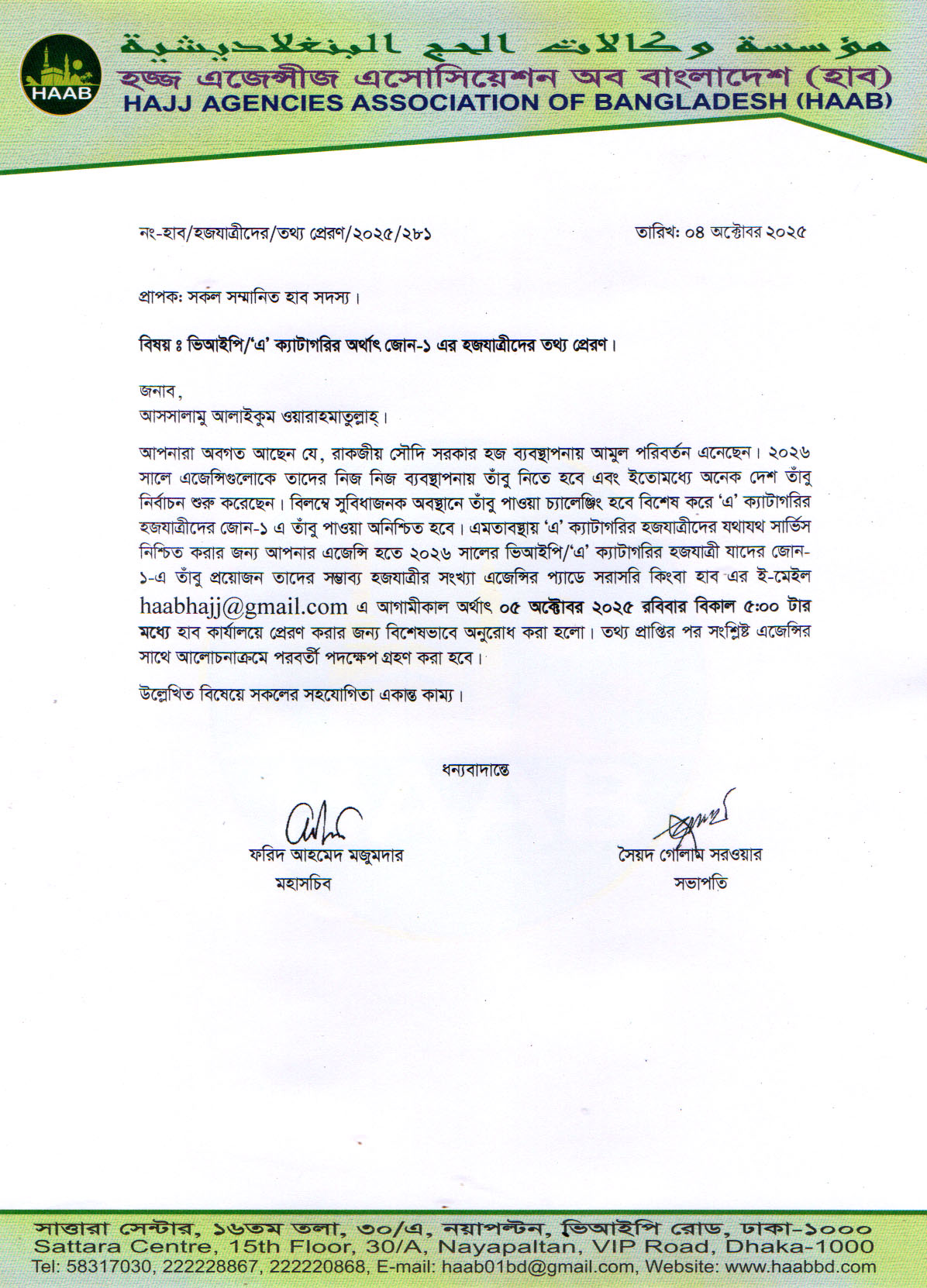 ভিআইপি/‘এ’ ক্যাটাগরির অর্থাৎ জোন-১ এর হজযাত্রীদের তথ্য প্রেরণ।