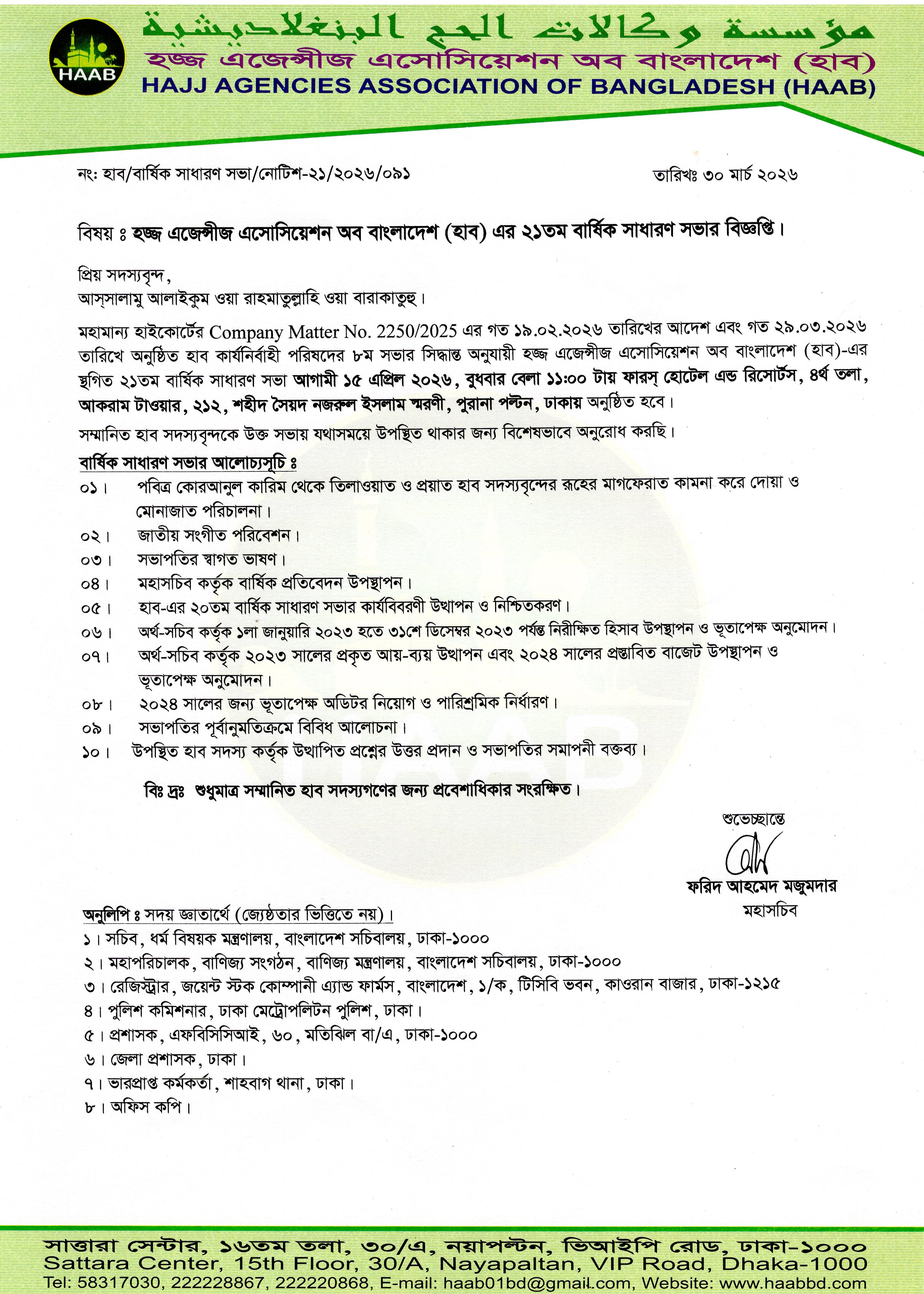 হজ্জ এজেন্সীজ এসোসিয়েশন অব বাংলাদেশ (হাব) এর ২১ তম বার্ষিক সাধারণ সভার বিজ্ঞপ্তি।